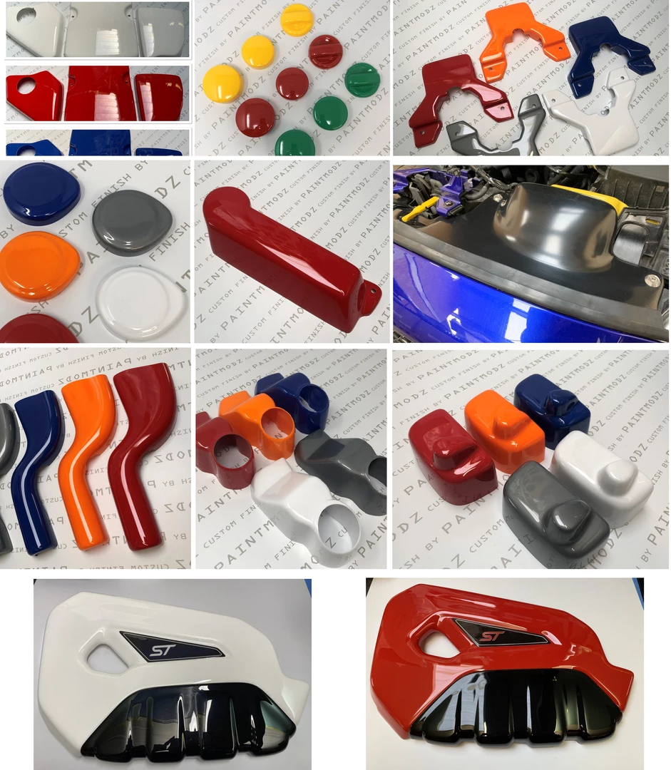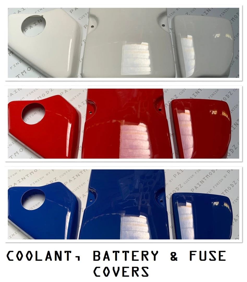 These covers are available in an assortment of coloured plastics and have been manufactured from coloured material rather than prepped, painted and lacquered. Please bear in mind before purchasing that these are not perfectly colour matched to the vehicle colours. Alternatively, the covers are available in smooth plastic, which is ready to be painted, and textured OEM plastic.  The covers can simply be removed for servicing or should you fancy changing the theme of your engine bay.Â