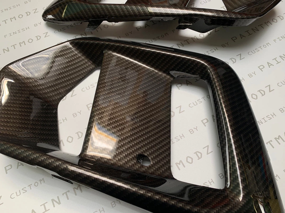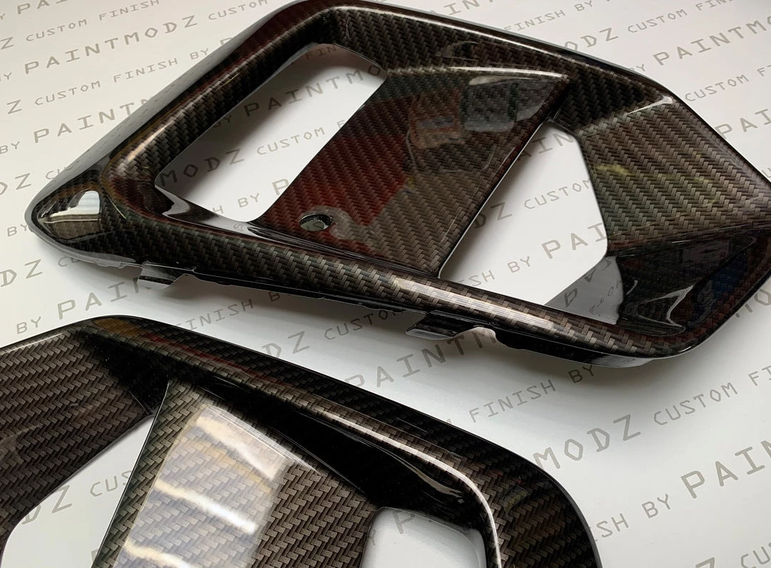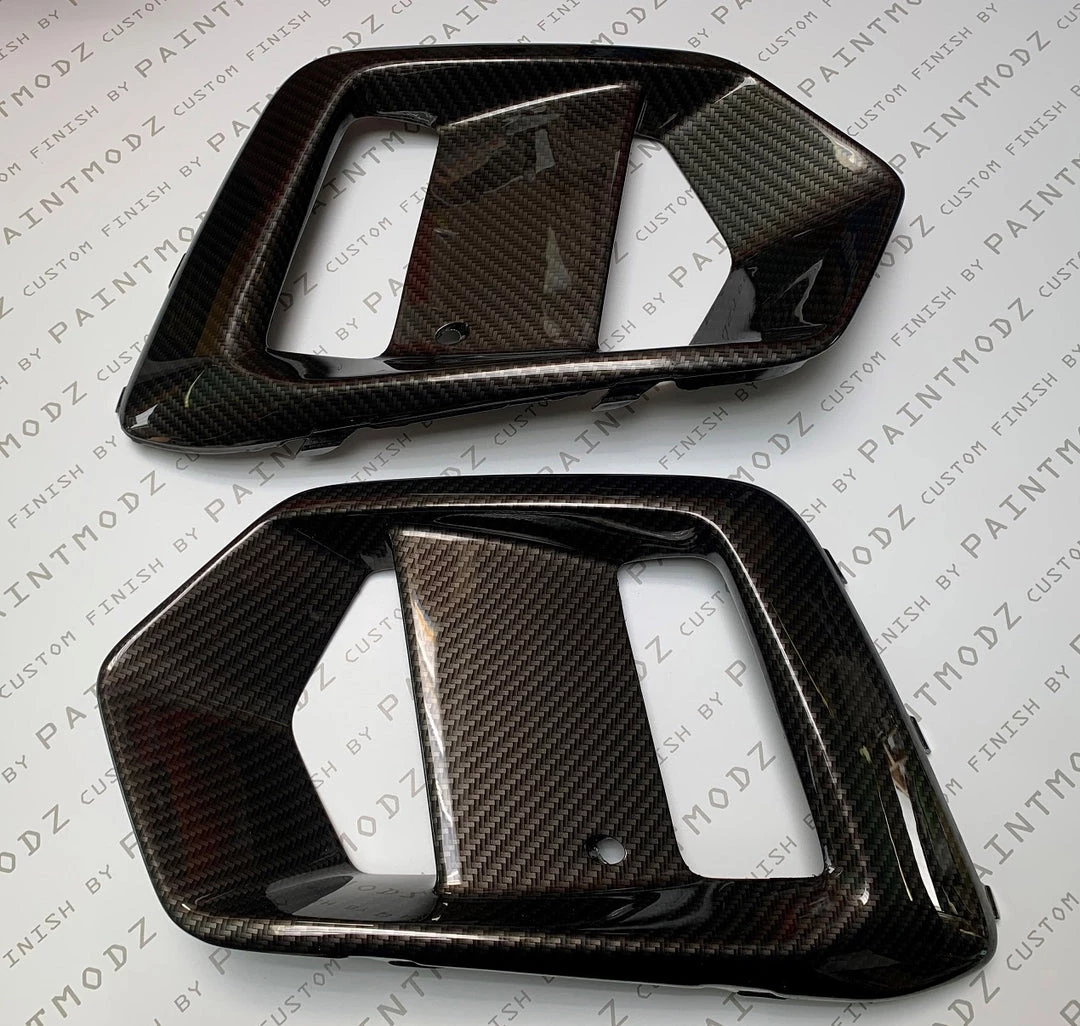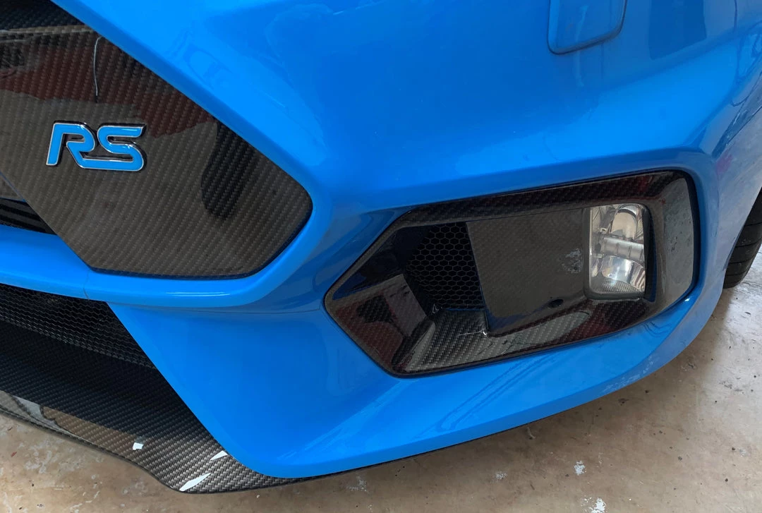 A pair of Genuine Ford Focus RS fog light surrounds. To ensure the longevity of the finish. these parts have all of the texture removed (by hand) before being primed, wet sanded, painted, hydrodipped and polished. We can also provide a range of other hydrodip finishes as a custom order – please contact us for details.