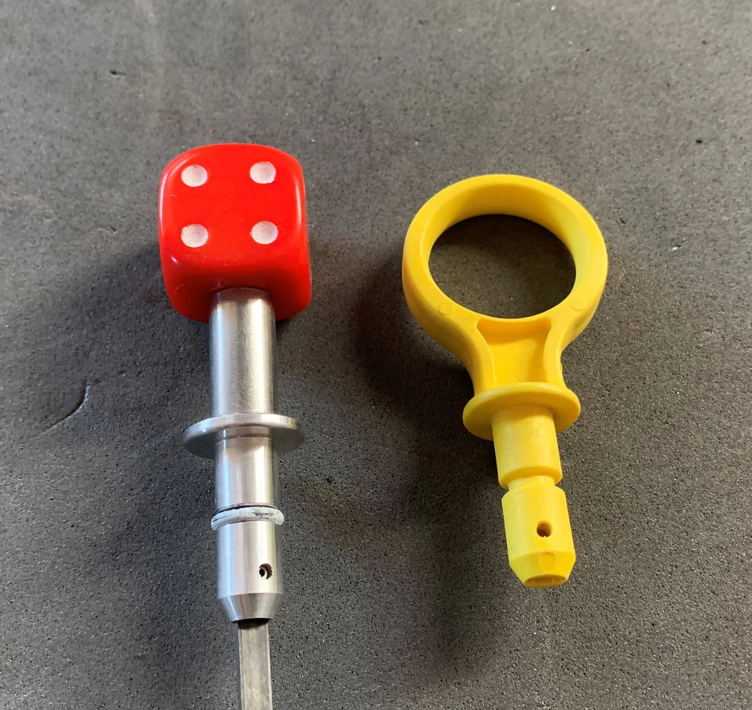 A custom dice dipstick topper which gives that quirky touch to your engine bay. A machined alloy base which replaces the whole Ford yellow hoop so no need to chop down your existing item. Fitting is simple, you just remove the rubber seal off your Ford item and push out the pin. Side the metal strip into your new dipstick topper, refit the pin and rubber, then refit to the car.