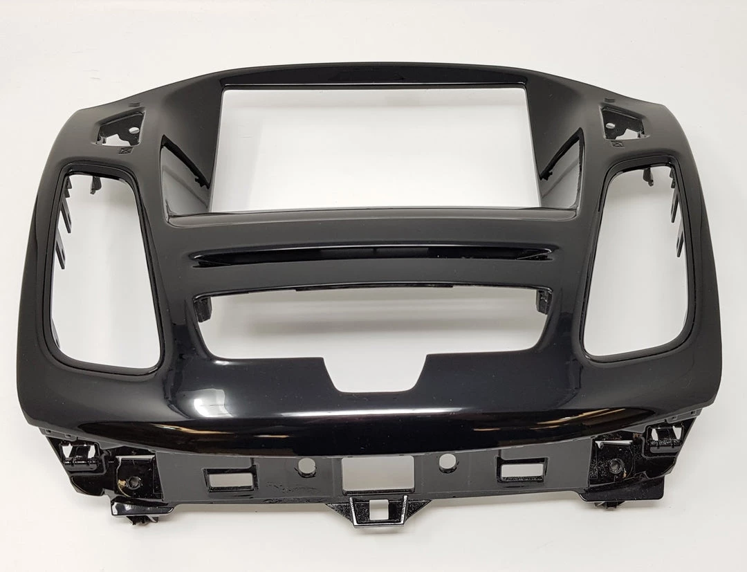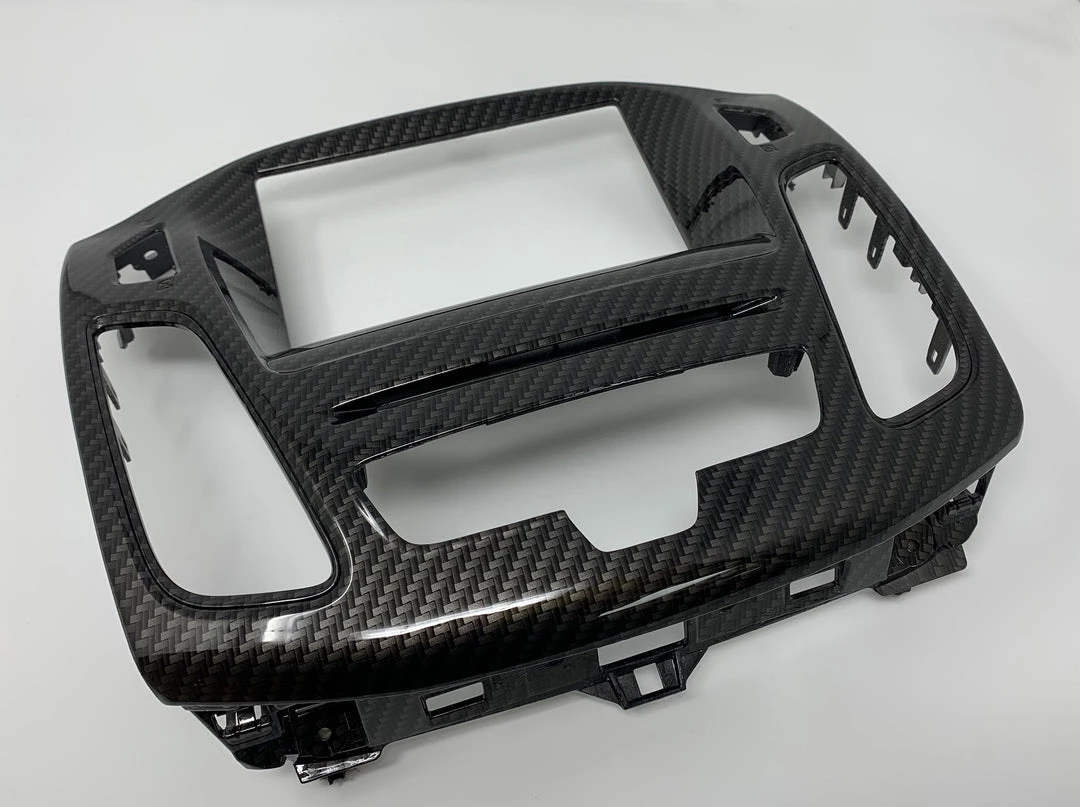 A MK3.5 Ford Focus (including RS/ ST) centre console screen surround which has been painted Gloss Black or hydrodipped in our carbon fibre print.Â