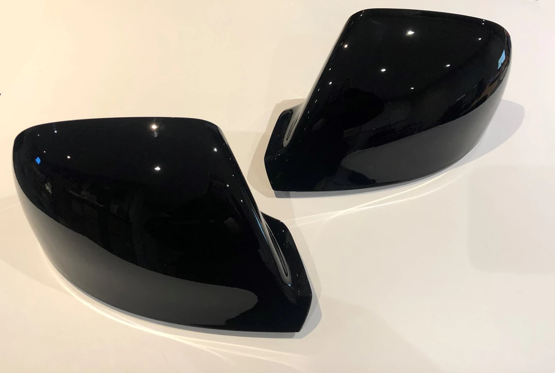 A pair of Volkswagen Transporter high quality replacement mirror covers finished in high gloss black base coat and lacquer.